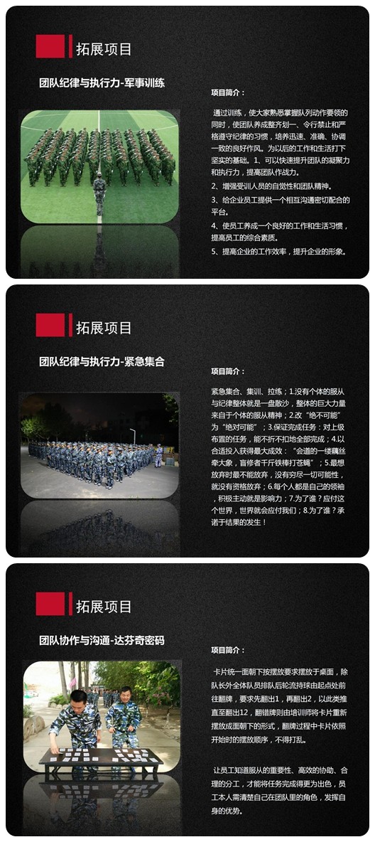 以经典执行力拓展训练项目《极速时限》、《达芬奇密码》、《核弹危机》、《穿越电网》为主线,辅以军事训练元素,强调对任务高效、精确的执行和对团队总目标的服从。